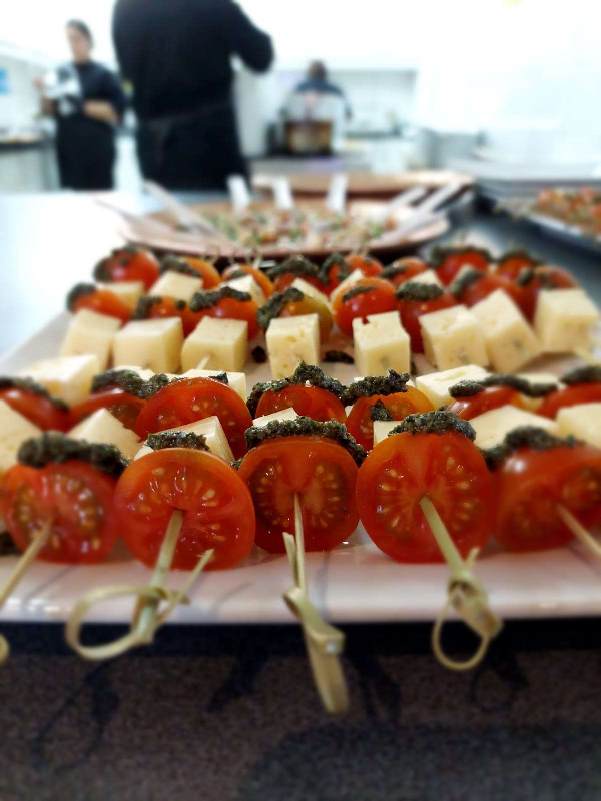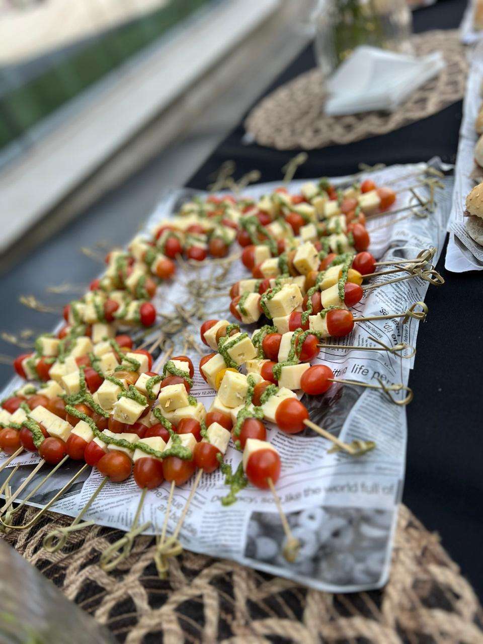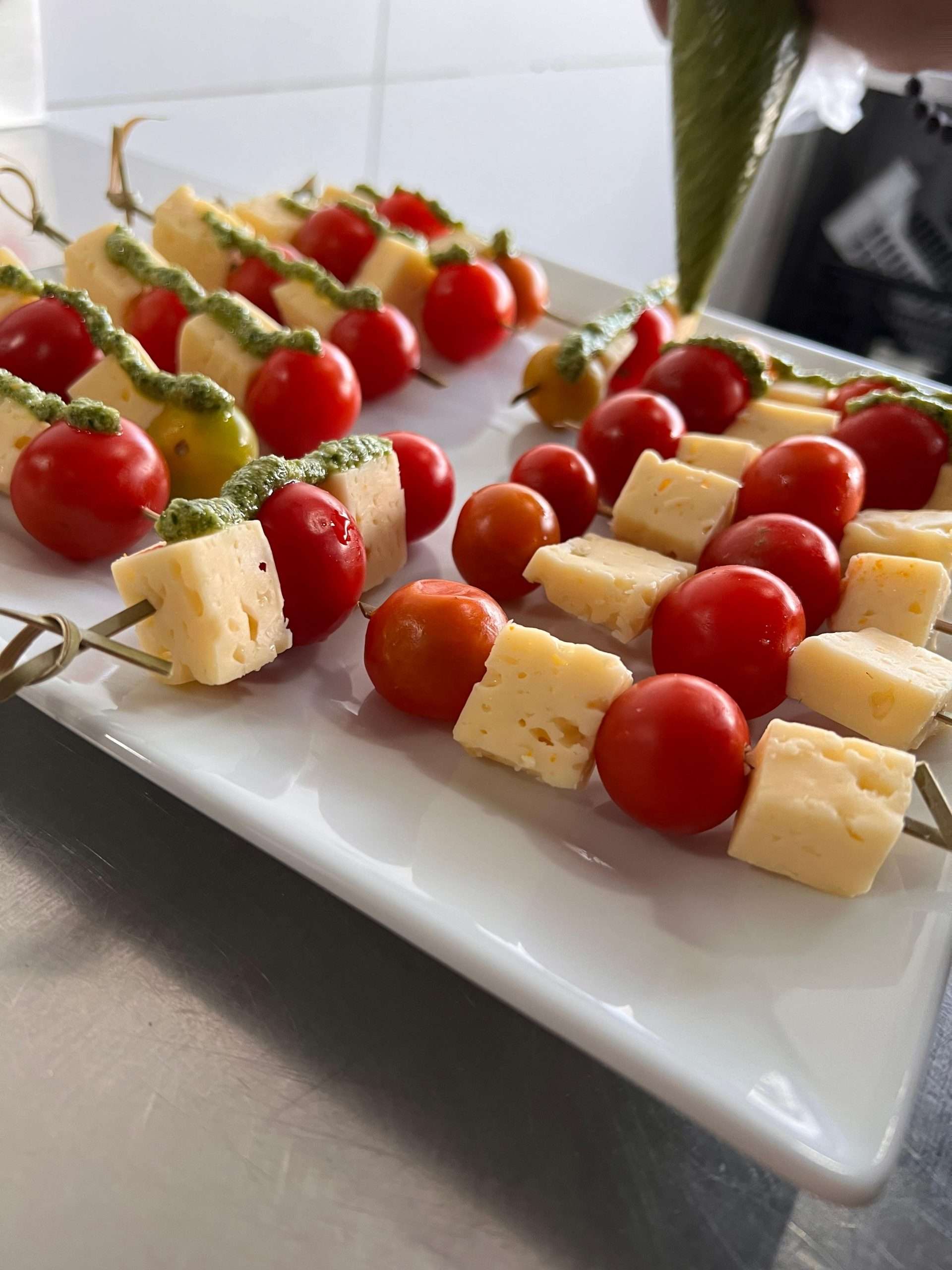 Frescas y exquisitas brochetas capresse compuestas de Queso mentecoso, tomate cherry y pesto casero