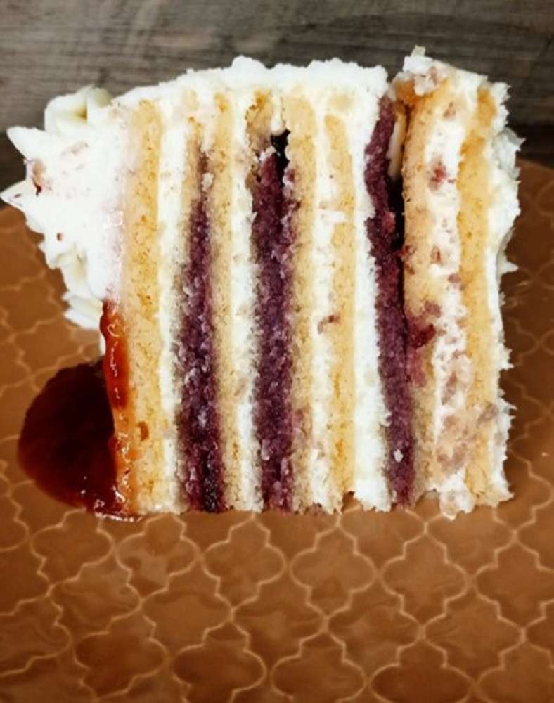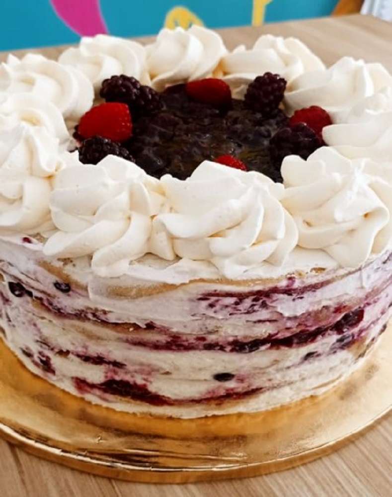 Panqueque Cheesecake frutos rojos. Suave masa en base a panqueque, rellena con deliciosa crema de cheesecake y nuestra mermelada casera de frutos rojos. Decorada con crema fresca